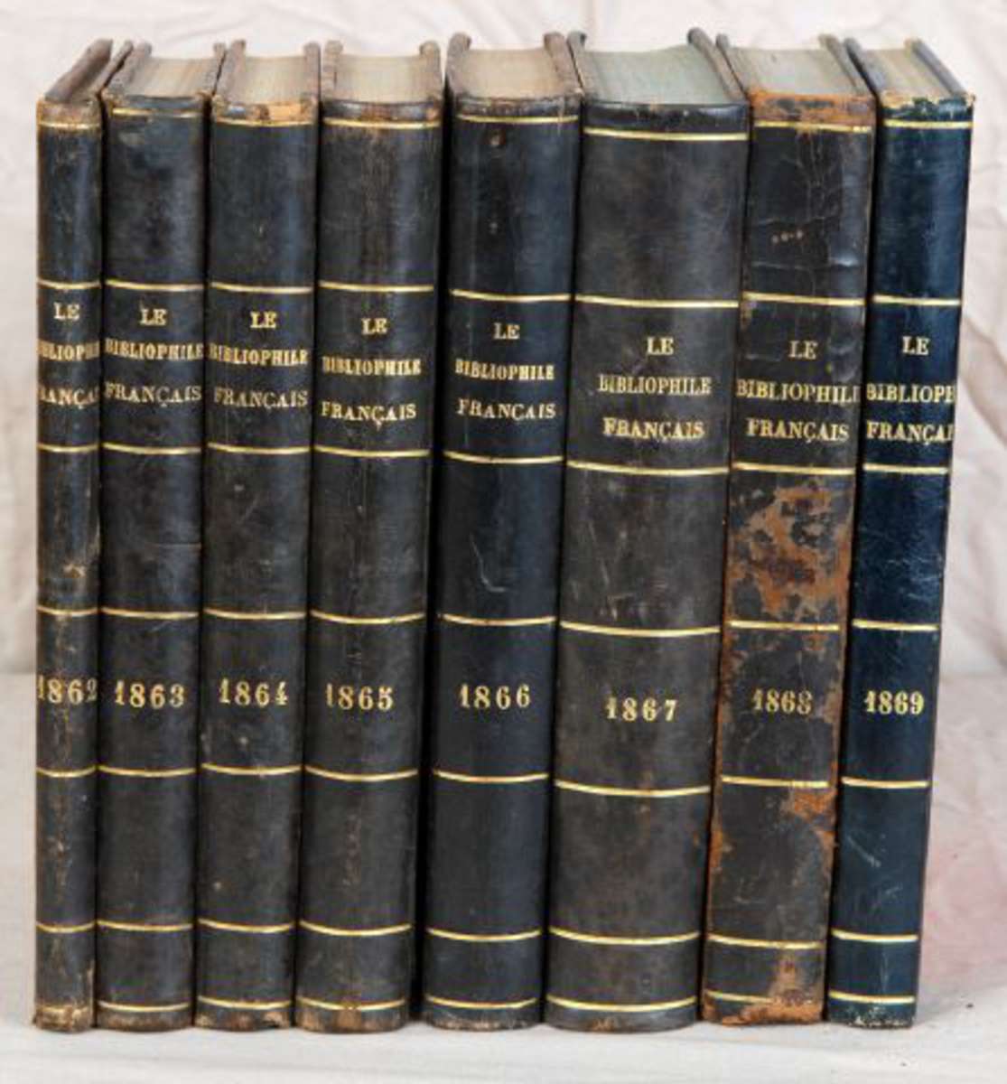 [Bibliophile français (Le)]. Revue mensuelle des livres anciens et modernes de la librairie Bachelin Deflorenne. Paris, 1862-1869. 8 volumes in-8, demi-basane noire, filets dorés, titre et date en lettres et chiffres dorés sur le dos. (Reliure de l'époque). Du numéro 1 (1ère année) au numéro 12 du 15 décembre 1869. Les fascicules sont reliés par année. Outre les innombrables livres proposés, on trouve des commentaires sur les ventes publiques et quelques articles bibliographiques.