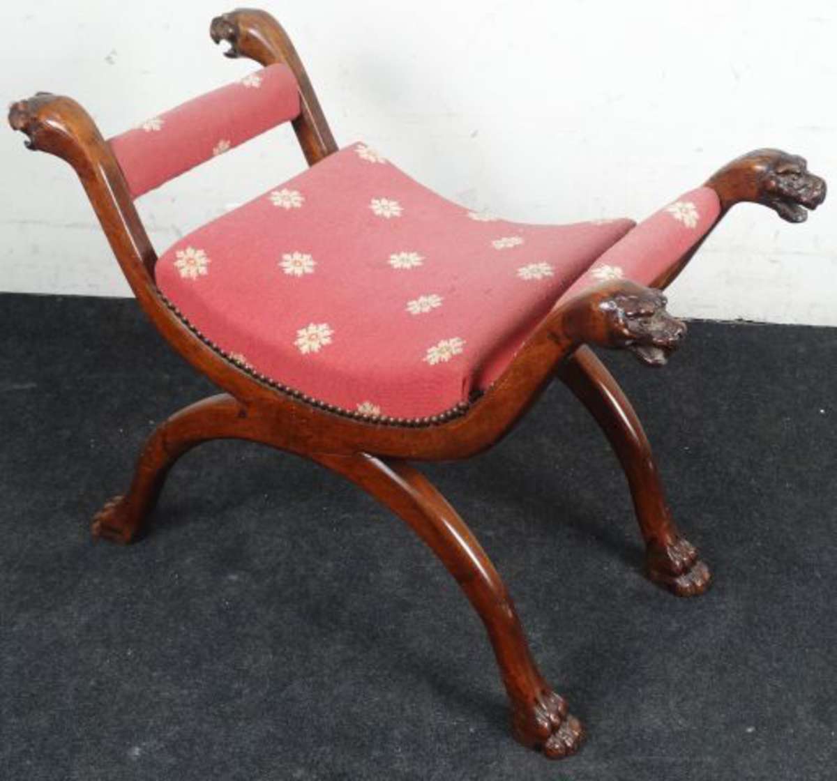 Siège curule en acajou, les montants d'accotoirs terminés par des têtes de monstres, les pieds par des griffes. XIXe. 55 x 80 x 39 cm