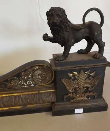 Barre de foyer en bronze patiné et doré, à décor de lion passant. Style Empire.