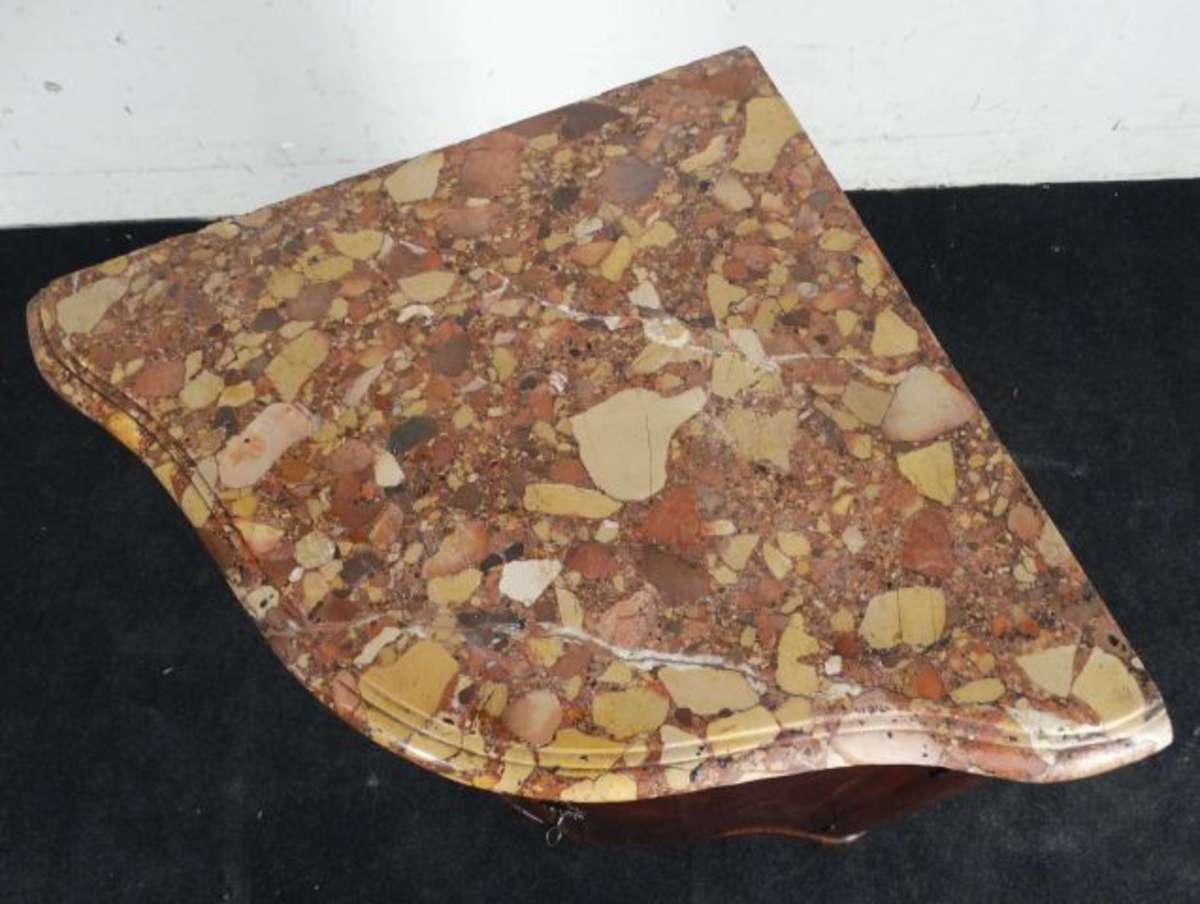 Encoignure en bois de placage à façade galbée ouvrant par deux vantaux et reposant sur deux pieds légèrement galbés. Dessus de marbre brèche. Epoque Louis XV. Estampillée de P. Denizot. 90,5 x 74 cm. (accidents)