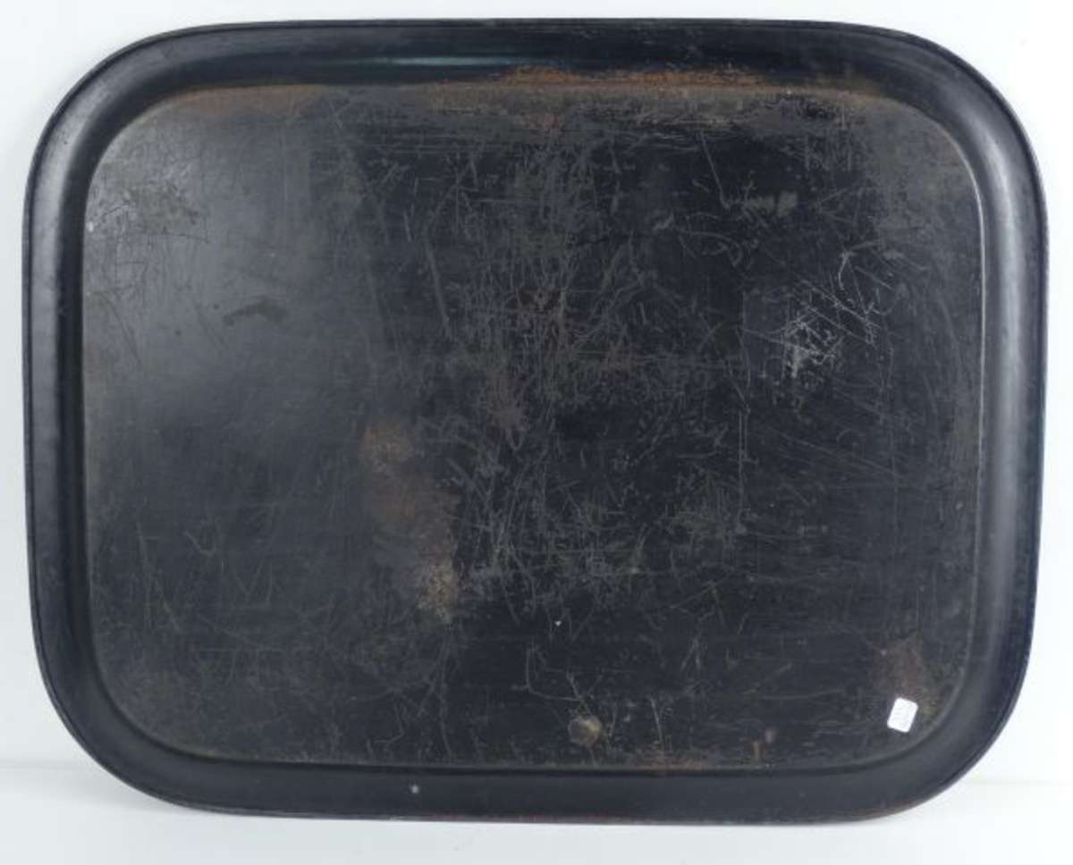 Grand plateau rectangulaire en tôle laquée noire et or à décor aux chinois. 74 x 58 cm.