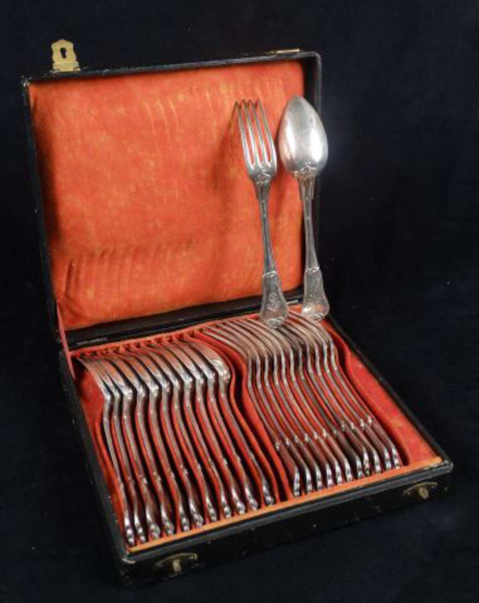 Ensemble de douze couverts en argent, modèle au nœud gordien, chiffrés, poinçon Minerve. Pds: 2115 gr. Dans leur écrin.