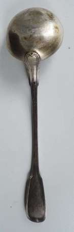 Louche en argent, modèle filet, à spatule monogrammée. Longueur: 31 cm Pds: 181 gr.