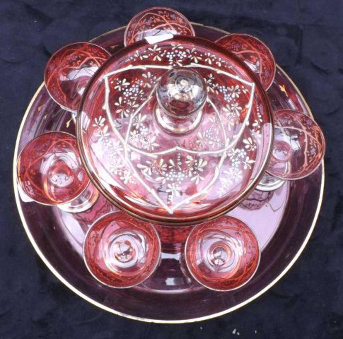 Service à cerises à l'eau-de-vie en verre teinté rose à décor doré et émaillé comprenant un plateau, sept verres et une coupe couverte à pied. Fin XIXe début Xxe.