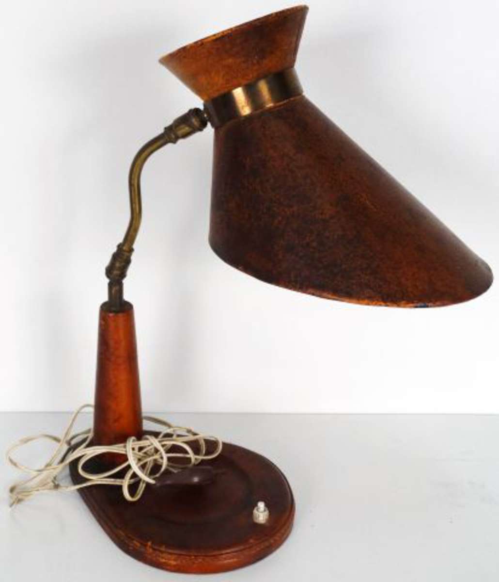 ADNET Jacques (dans le goût de) Lampe de bureau en cuir couleur havane, rotules et bras articulé en laiton, abat-jour de forme diabolo. Vers 1950. Hauteur : 47 cm. (Usures)