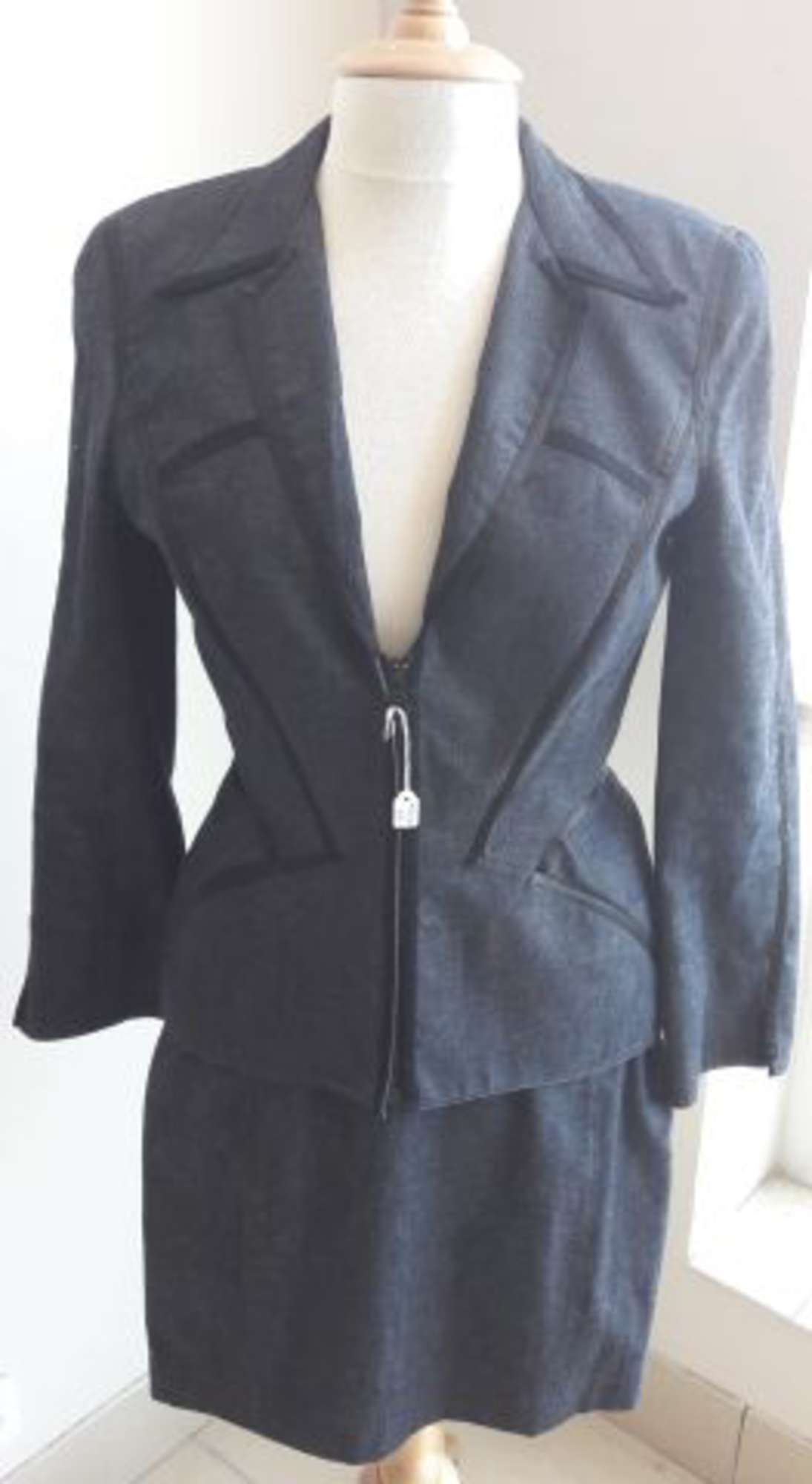 THIERRY MUGLER - Tailleur sport Vintage en coton denim à décor géométrique galonné T.40
