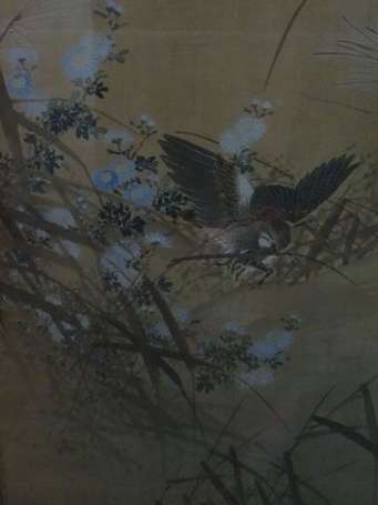 JAPON - Oiseaux en chasse. Peinture polychrome sur lin. A vue :136 x 50 cm (taches)