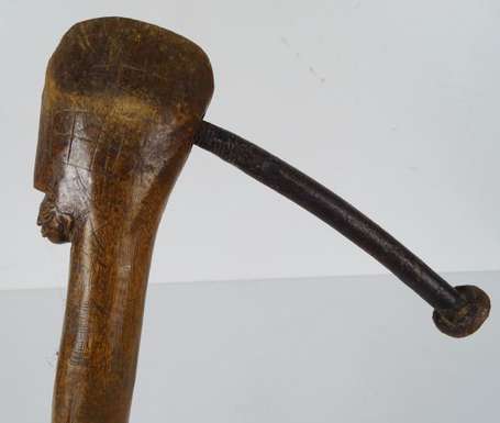 Ancienne récade de cérémonie au fer en forme de talon. Tête sculptée en haut du manche. Patine d'usage