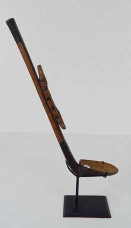 Ancien marteau à musique en bois dur décoré d'un oiseau. Belle patine d'usage sombre. H 25,5 cm. Baoulé.