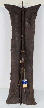 Ancien bouclier de combat en cuir de buffle et bois. Belle patine d'usage. Vieille étiquette marquée '' Kapiski près des Monts Mandana - Nord Cameroun''. H 85 cm. Turkana. Kenya
