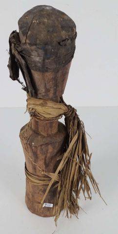 Fétiche d'autel représentant une tête juste esquissée, bandeau en tissu et collier en paille habillent