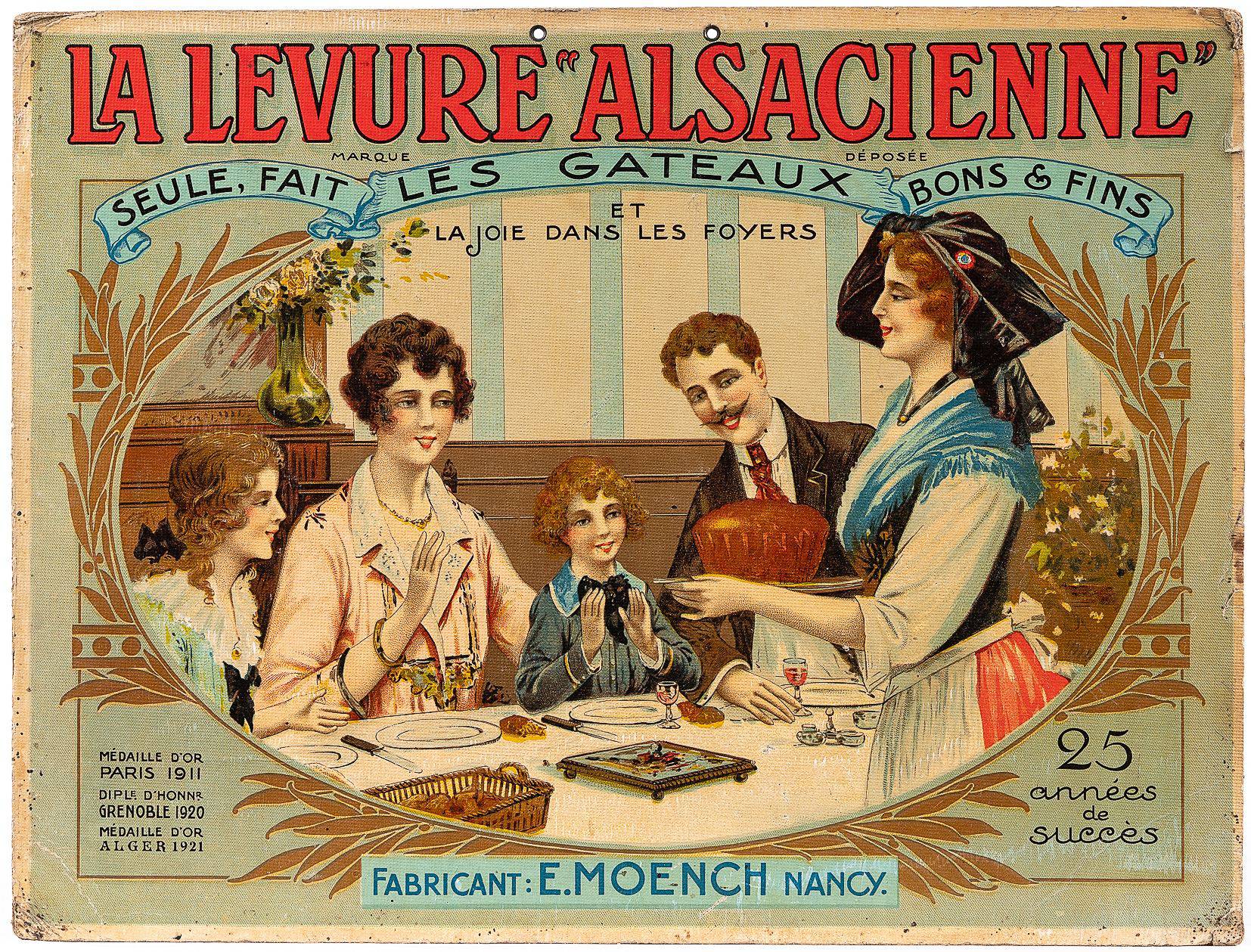 LEVURE ALSACIENNE /E.Moench : "Seule, fait les Gateaux Bons & Fins…et la Joie dans les Foyers" : Panonceau lithographié illustré d'une Lorraine servant le dessert à une famille attablée. Ca 1920, Format : 39,8 x 30,1cm.