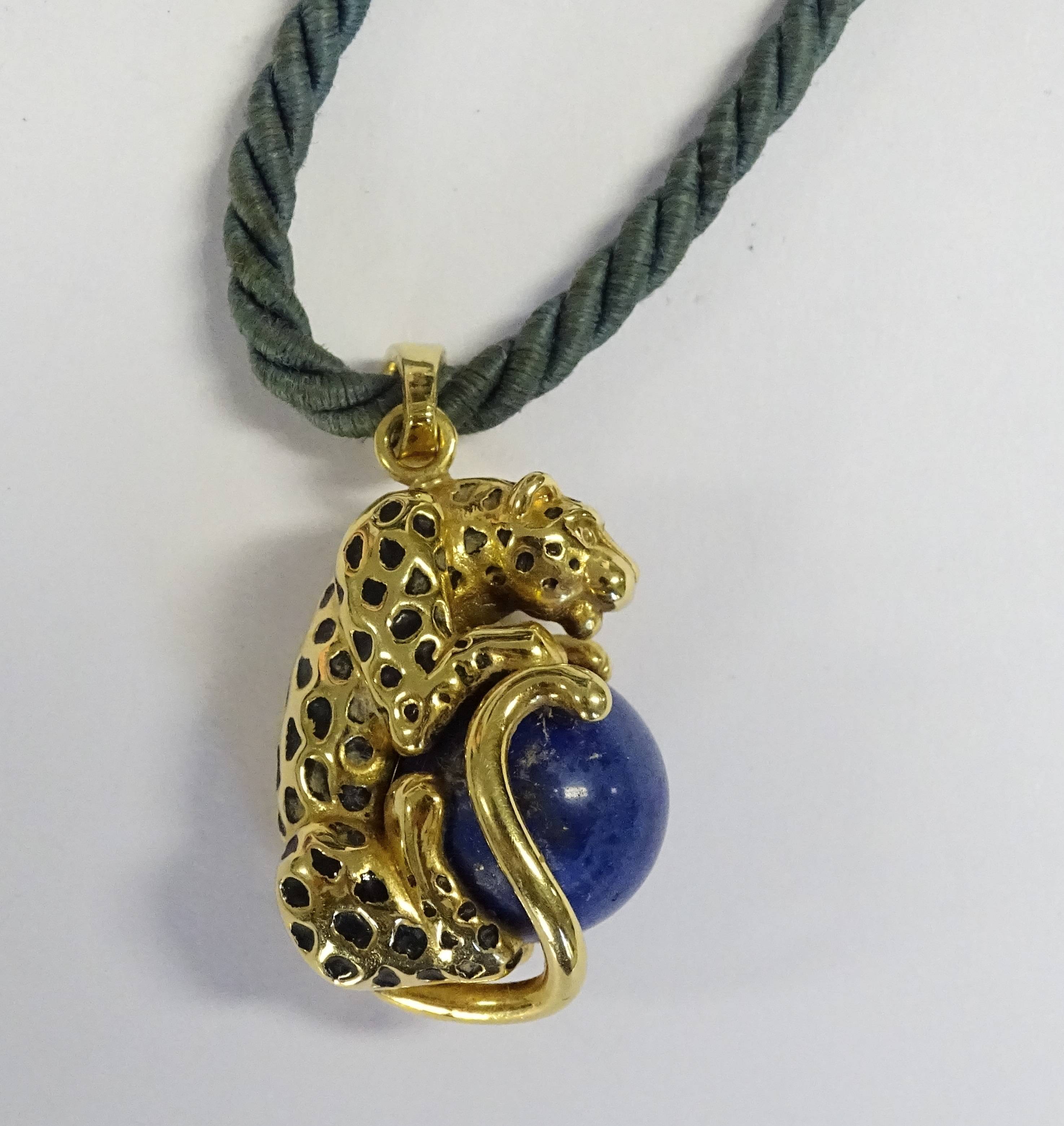 Pendentif en or jaune 18K (750°/00) à motif d'une panthère dans le goût de Cartier, sur un cordon de soie fermoir mousqueton en or jaune. PB pendentif : 8,7 g