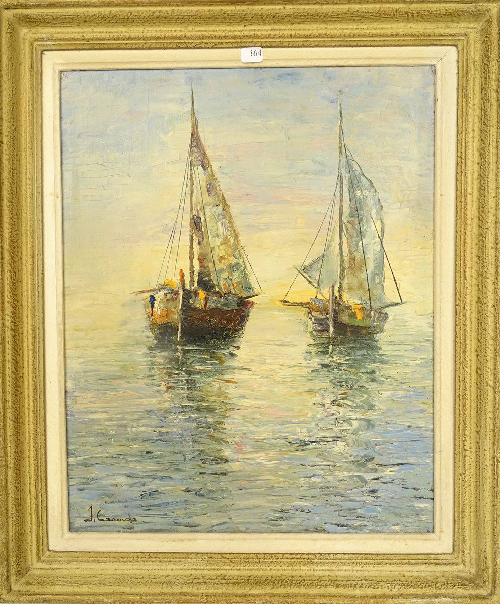 CANOVAS J. XXe - Deux barques en pêche. Huile sur panneau d'isorel, signée en bas à gauche. 41 x 32,5