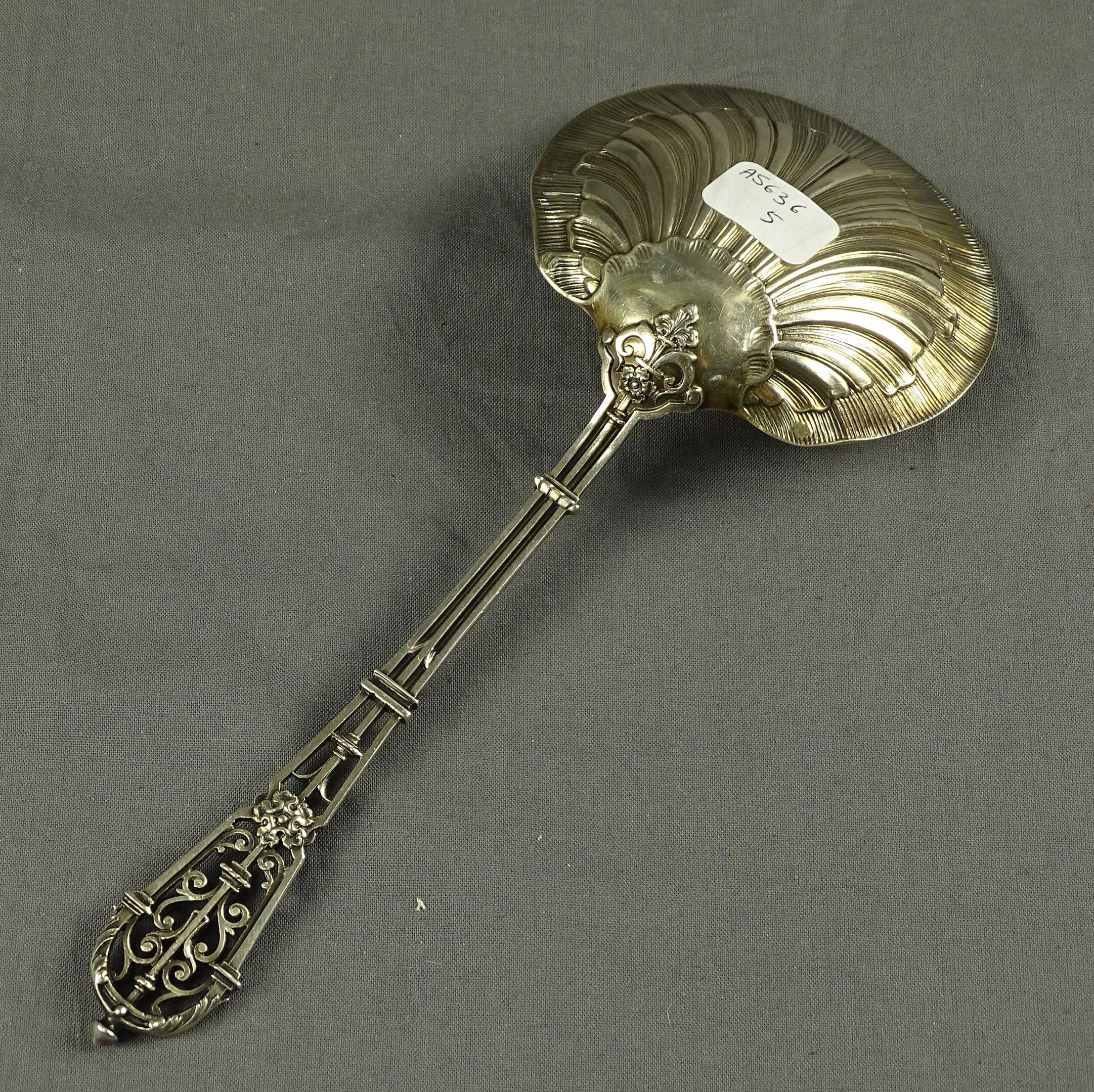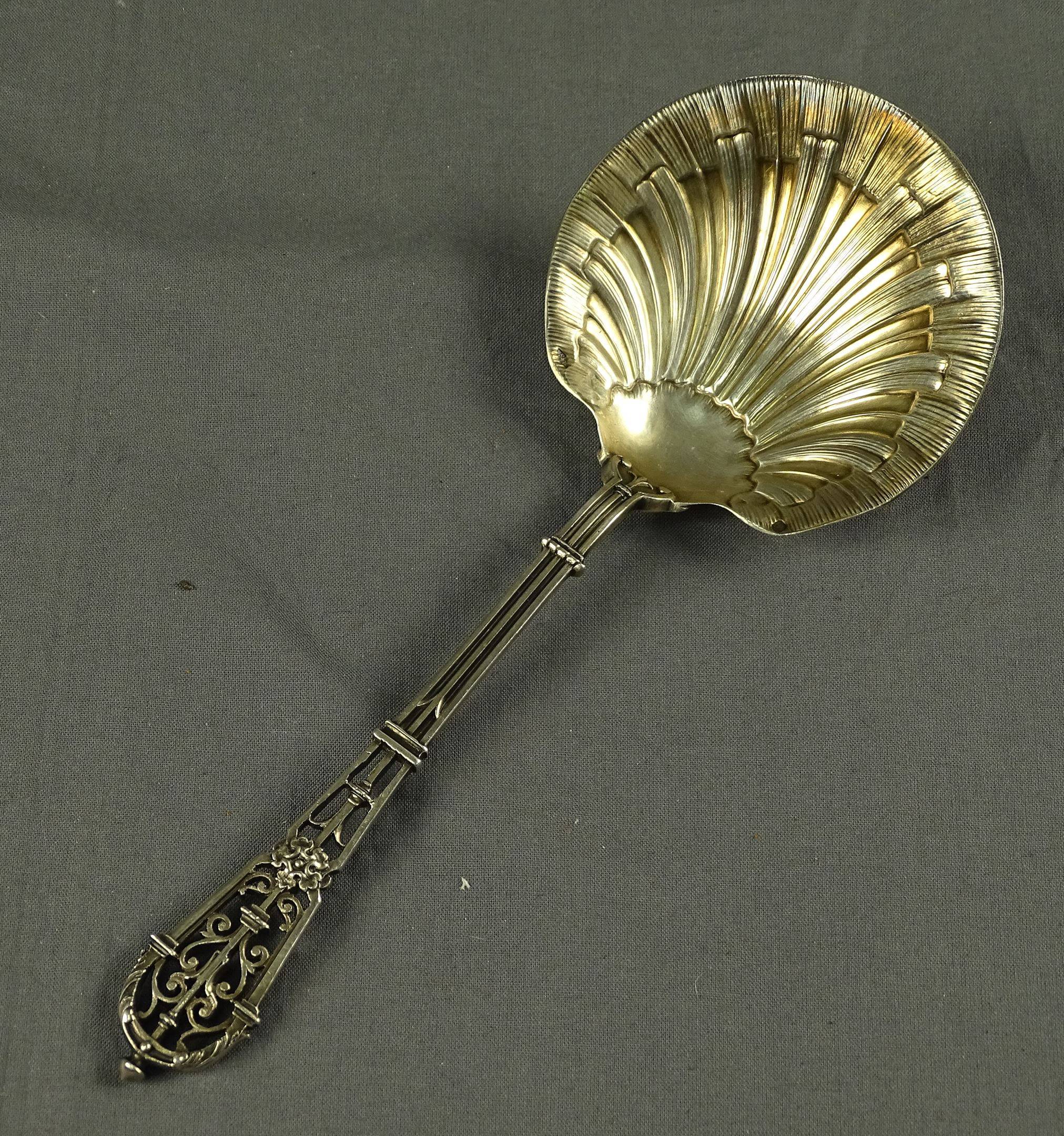 Pelle à fraises en argent, le cuilleron à motif de coquille stylisée, la branche cannelée, la spatule