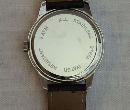 ZERMATT et EIGER - Montre bracelet d'homme, le boîtier rond en acier, le cadran à fond noir à index et chiffres romains et trois compteurs, le bracelet cuir noir (rapporté). En boite avec papiers.