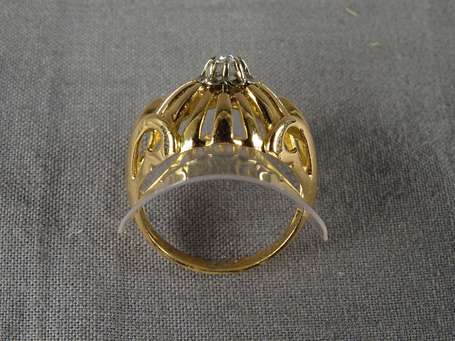 Bague dôme ajourée en or jaune 18K (750°/00) montée d'un zircon. TDD. 51. P. brut : 4,2 g