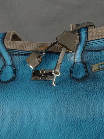 V°73 - Sac cabas en coton taupe, à décor enduit bleu en trompe-loeil d'un sac, fermeture par bouton pression, complet de sa clé sous cloche et de son cadenas. Très bel état, avec sa housse de protection en vinyle contre la pluie. 35 x 43 cm