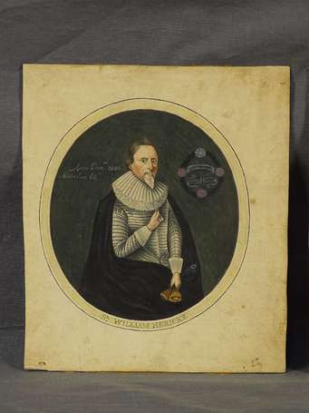 ECOLE ANGLAISE XVIIe - Double portraits de Sir William HERICKE et Mrs Marie BOND, wife of John EYRICK. Gouache et encre sur papier marouflé sur carton, inscriptions biographiques au dos. A vue : 20,5 x 18 cm.