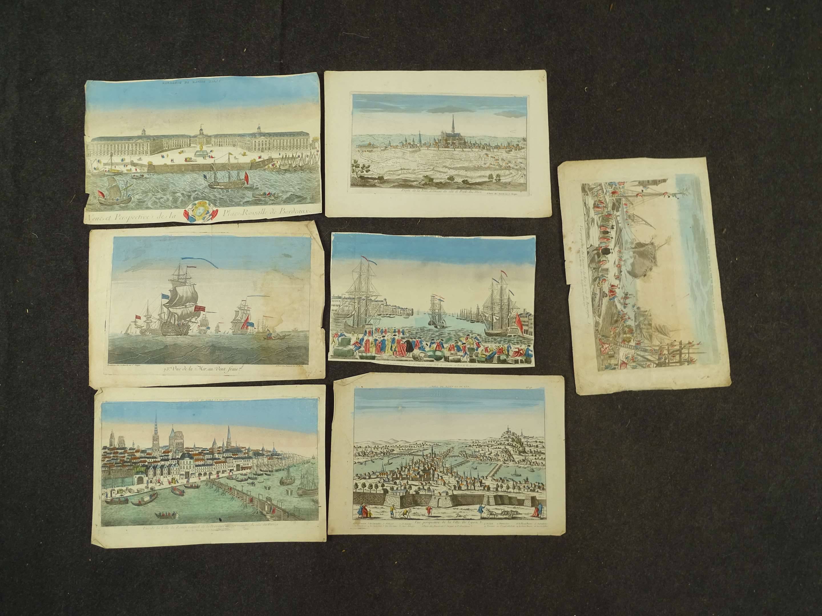 8 vues d'optique maritimes et rurales dont "perspective de la ville de Lyon", "vue du port de la Rochelle",