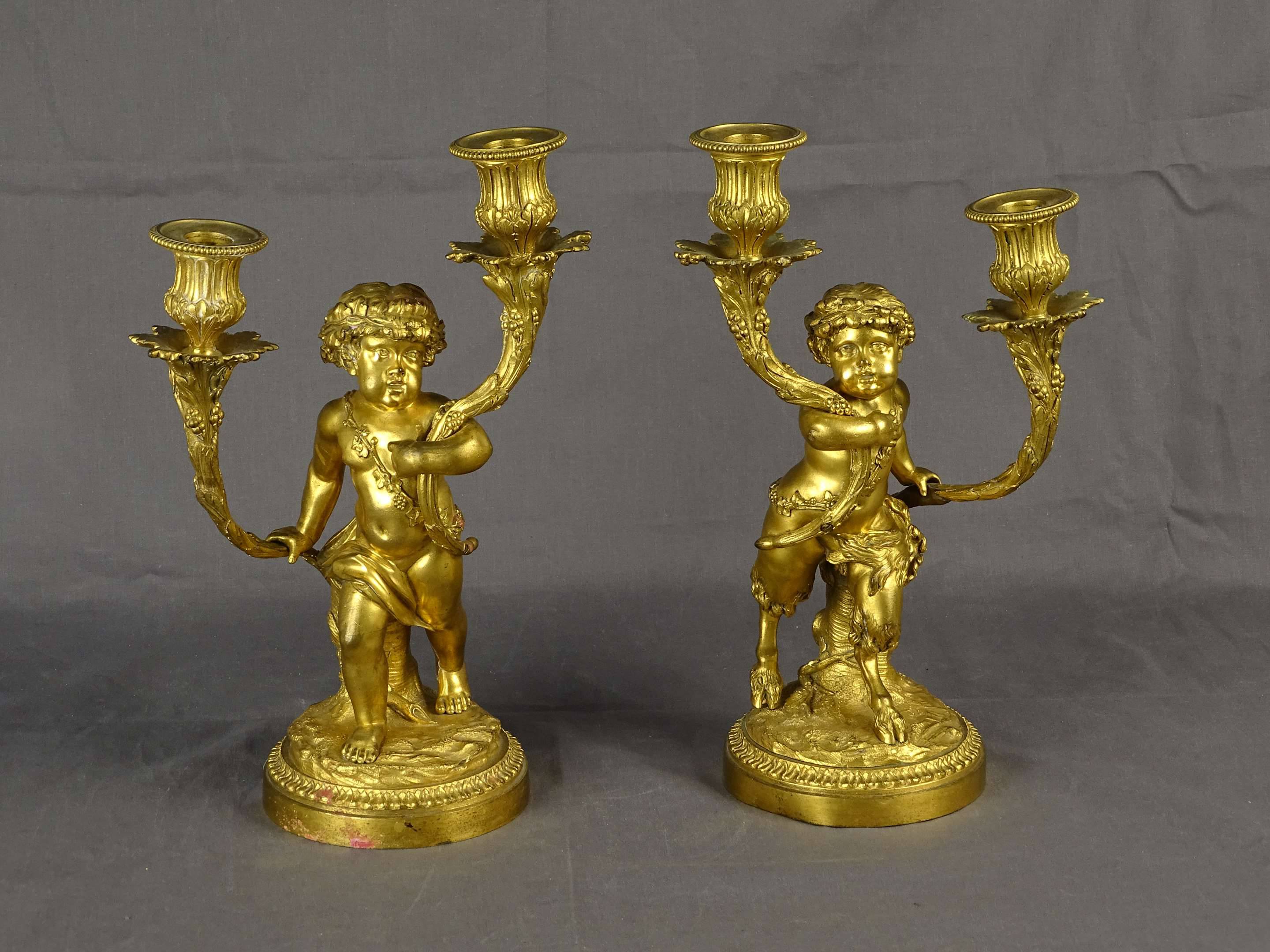 Paire de chandeliers en bronze doré, ils figurent un amour et un faune d'après Claude Michel dit Clodion
