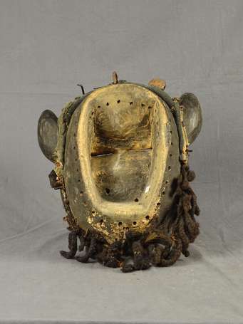 Grand et ancien masque en bois dur 'Wé' à cinq cornes. Ses yeux tubulaires sont bouchés par des tampons de tissu rouge. Clous de tapissier et grelots ainsi que des tresses de cheveux finissent de décorer ce masque puissant, et aussi 'inquiétant'. Patine laquée noire. Provenance R. Vanuxem 2002. H 37 cm. Guéré. R.C.I.