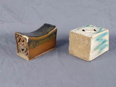 Deux anciens appui-nuques de fumeur en porcelaine à décor en vert sous couverte, et l'autre en céramique brune est ouvert aux extrémités afin d'y mettre de la braise et servir de chaufferette. L 21 et 16 cm. Chine