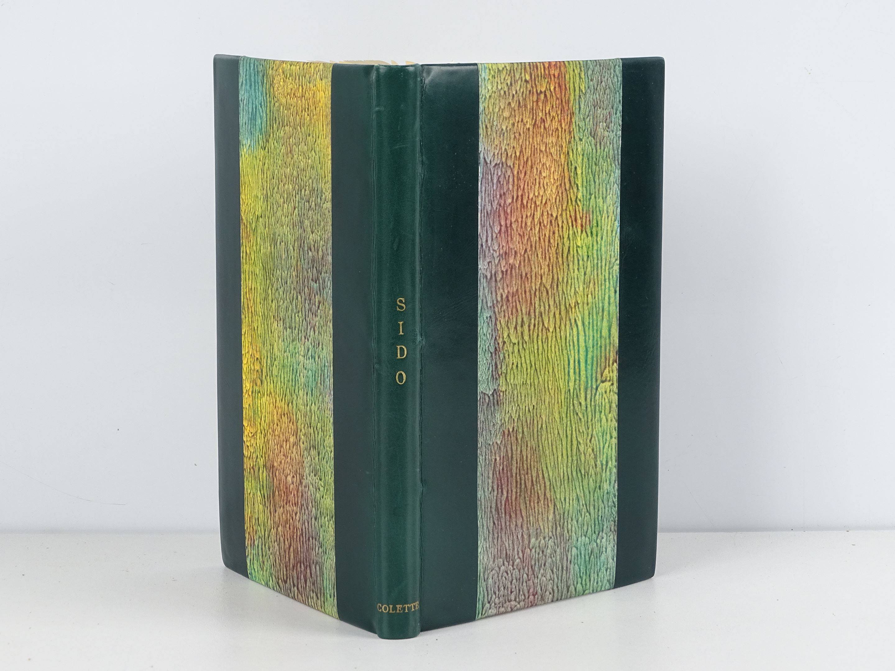 COLETTE - Sido - Paris ; J. Ferenczi et Fils, [1930] - 1 volume In-8° non rogné - 180, [1] pages - Reliure postérieure demi-box vert sapin à bandes signée Sophie Charlot - Papier des gardes décoré à l'identique des plats - Dos lisse titré or en long (infimes griffures et léger accroc) - Couvertures et dos conservés - Très bon exemplaire en édition originale, sur simili japon de couleurs numéroté H. C. 306 parmi les 120 réservés à l'auteur et à la presse (tirage total des exemplaires hors commerce : 353) - L'ouvrage est enrichi d'un envoi autographe signé de Colette à Aristide Briand à l'encre noire en page de faux titre, ainsi que truffé d'un billet et d'une enveloppe de la main d'Aristide Briand, adressés à l'écrivain naturaliste et libertaire Lucien Descaves.