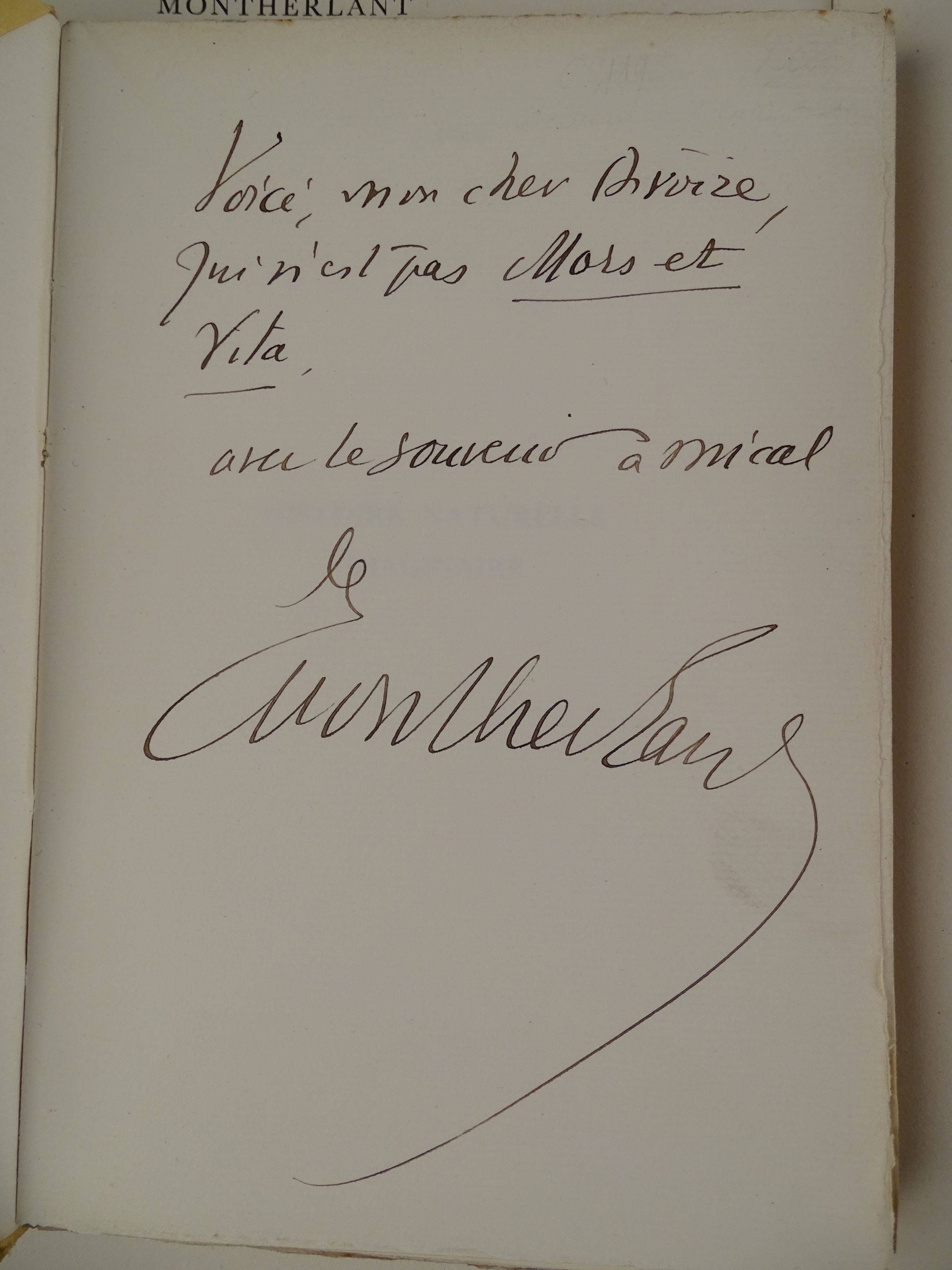 MONTHERLANT (Henry de) - [Ensemble de 2 volumes :] Histoire naturelle imaginaire - Paris ; Éditions du Trianon, 1933 - 1 volume In-12° broché sous couverture rempliée 4 cuivres animaliers hors texte de Ch. Guyot - Très bon exemplaire hors commerce numéroté sur vergé de Rives (n°XLIX sur LV) enrichi d'1 envoi autographe signé de Montherlant à la 1ère garde blanche - Les Célibataires - Paris ; Flammarion, [1944] - 1 volume In-8° broché sous couverture rempliée - Illustrations in et hors texte en noir de F. M. Salvat - Très bon exemplaire numéroté sur vélin.