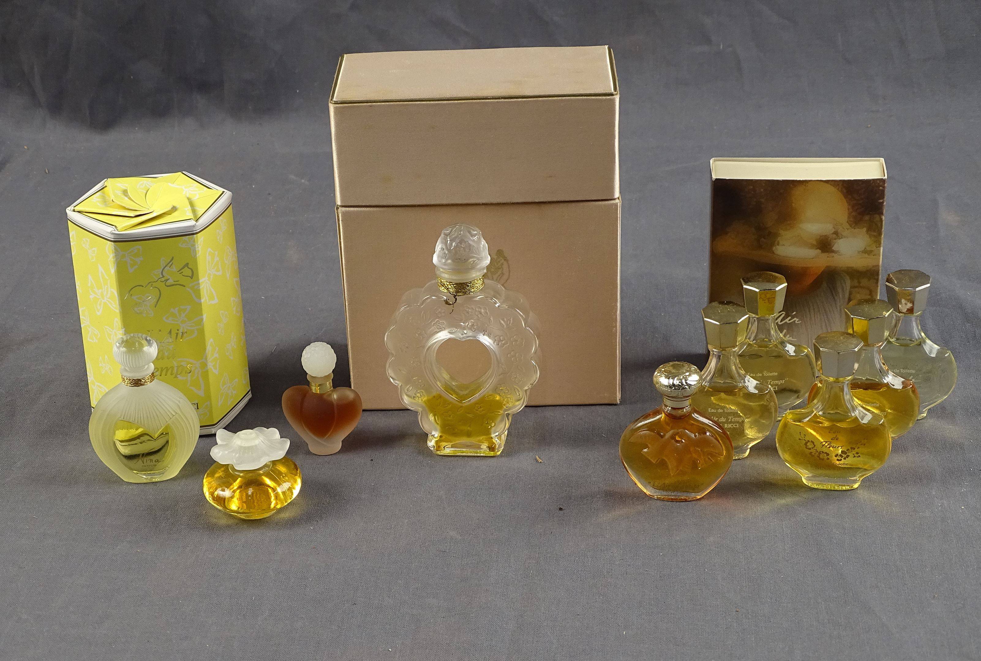 NINA RICCI - "Coeur Joie" - (1946) Premier parfum de cette maison de couture parisienne : présenté dans son coffret cubique en carton gainé de satin rose, intérieur satin blanc, titré, flacon en cristal incolore dépoli pressé moulé de section cubique, sa panse en forme de coeur polylobé évidé, à décor de fleurettes en réserves, son bouchon cabochon à décor moulé d'un papillon. titré sur sa base . modèle créé par Marc Lalique, signé Lalique France. (H 9 cm)On y joint un lot de diminutifs parfums de la même maison.