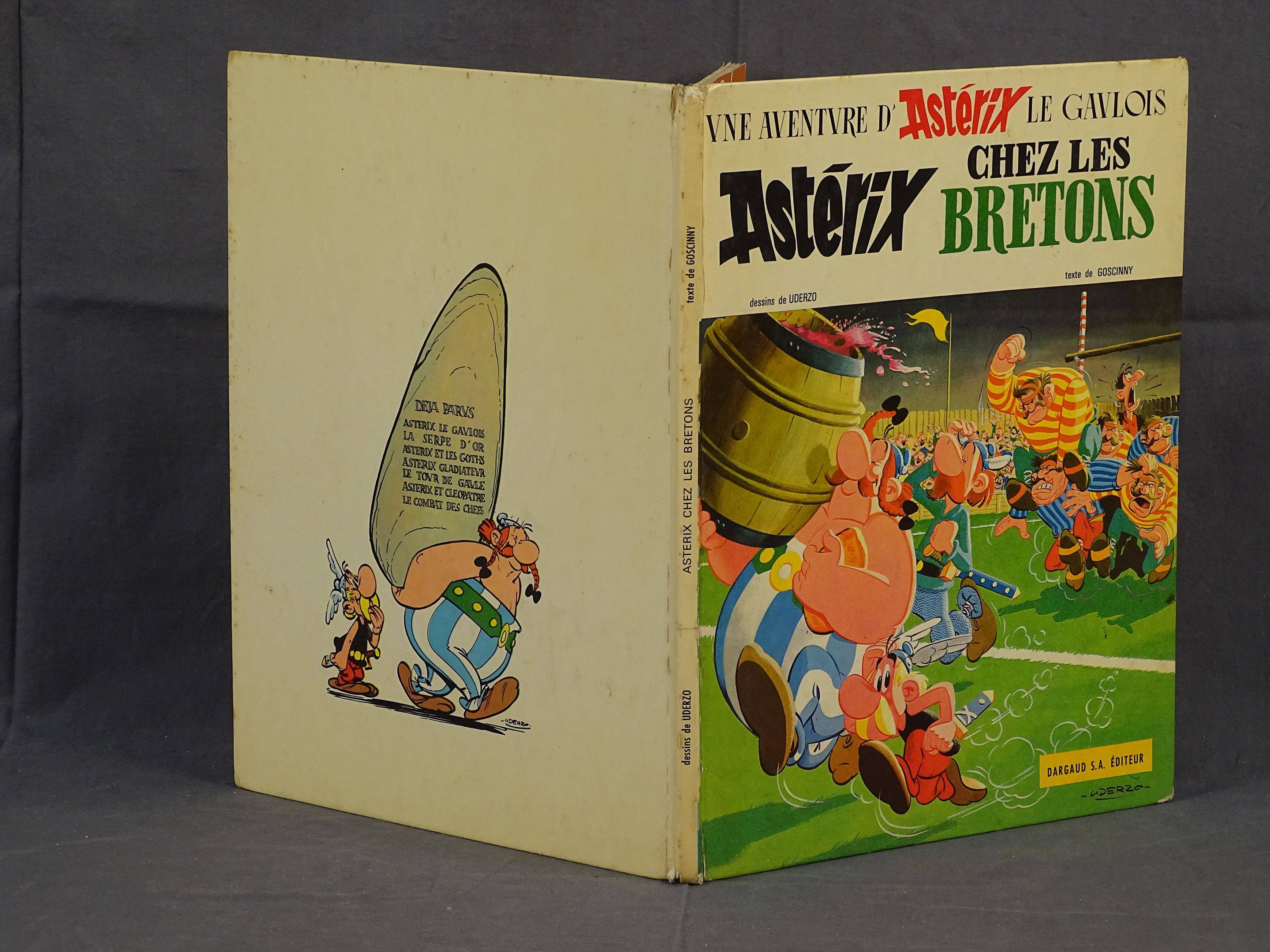 Uderzo : Astérix 8 ; Astérix chez les bretons en édition originale de 1966 en état moyen. Le mors du 1er plat est fendu sur 10 cm en bas. Intérieur en bel état.