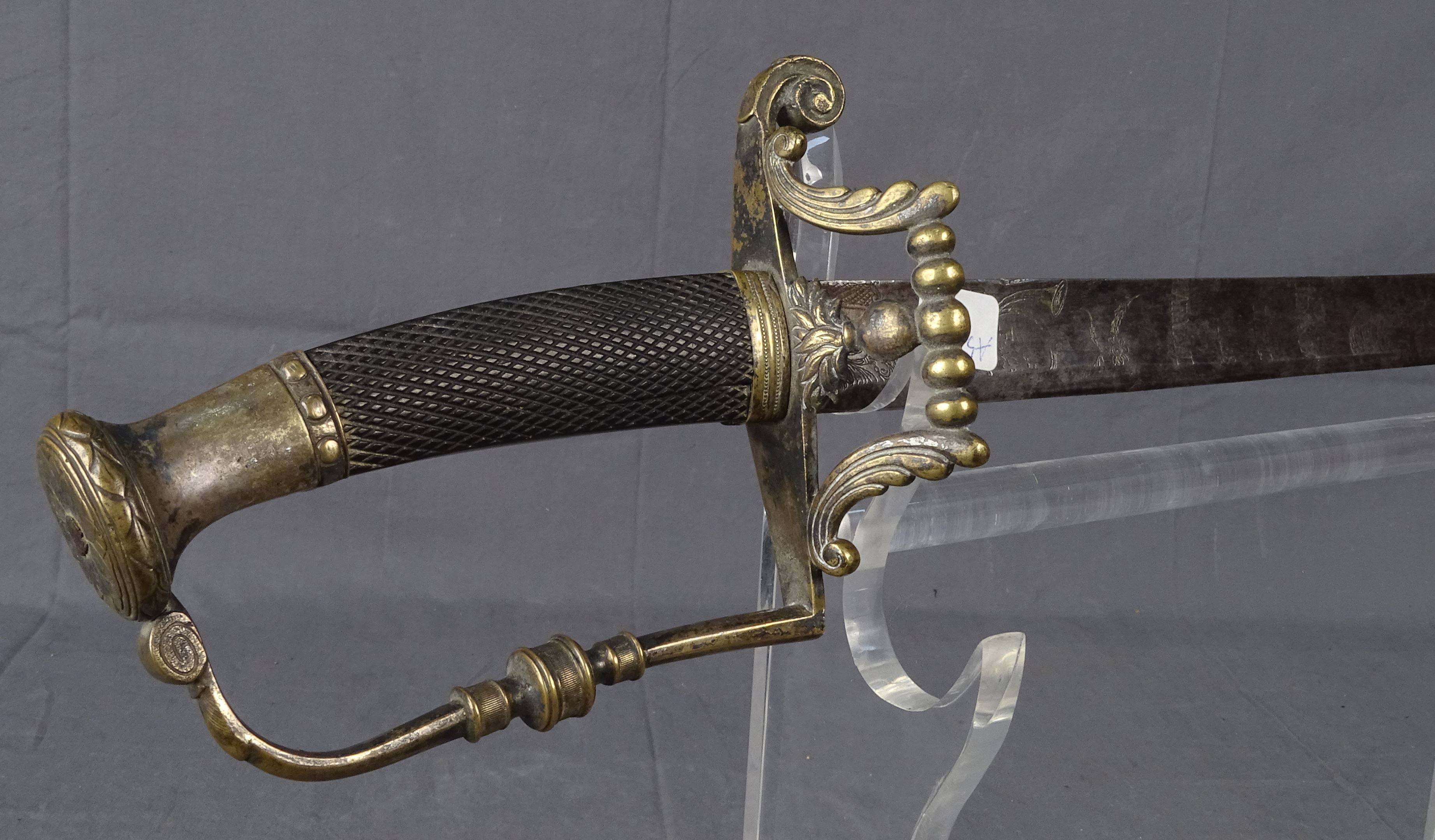 Epée d'officier XIXé, garde avec grenade, lame de sabre diminuée avec inscription, sans fourreau.