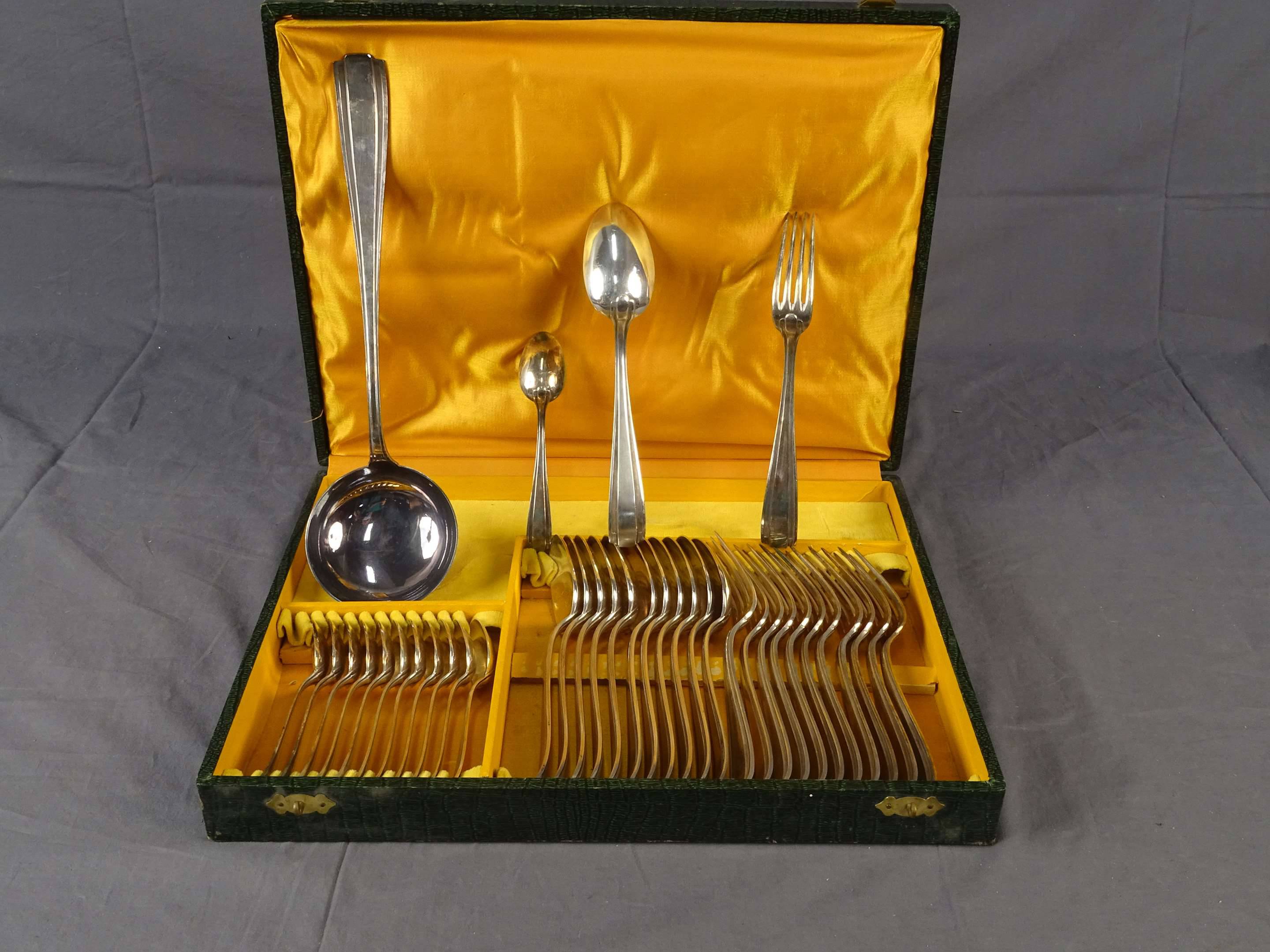 Boulenger Ménagère en métal argenté, la branche et la spatule soulignées d'un ruban plat. Elle comprend douze couverts, douze couverts à café, une louche.