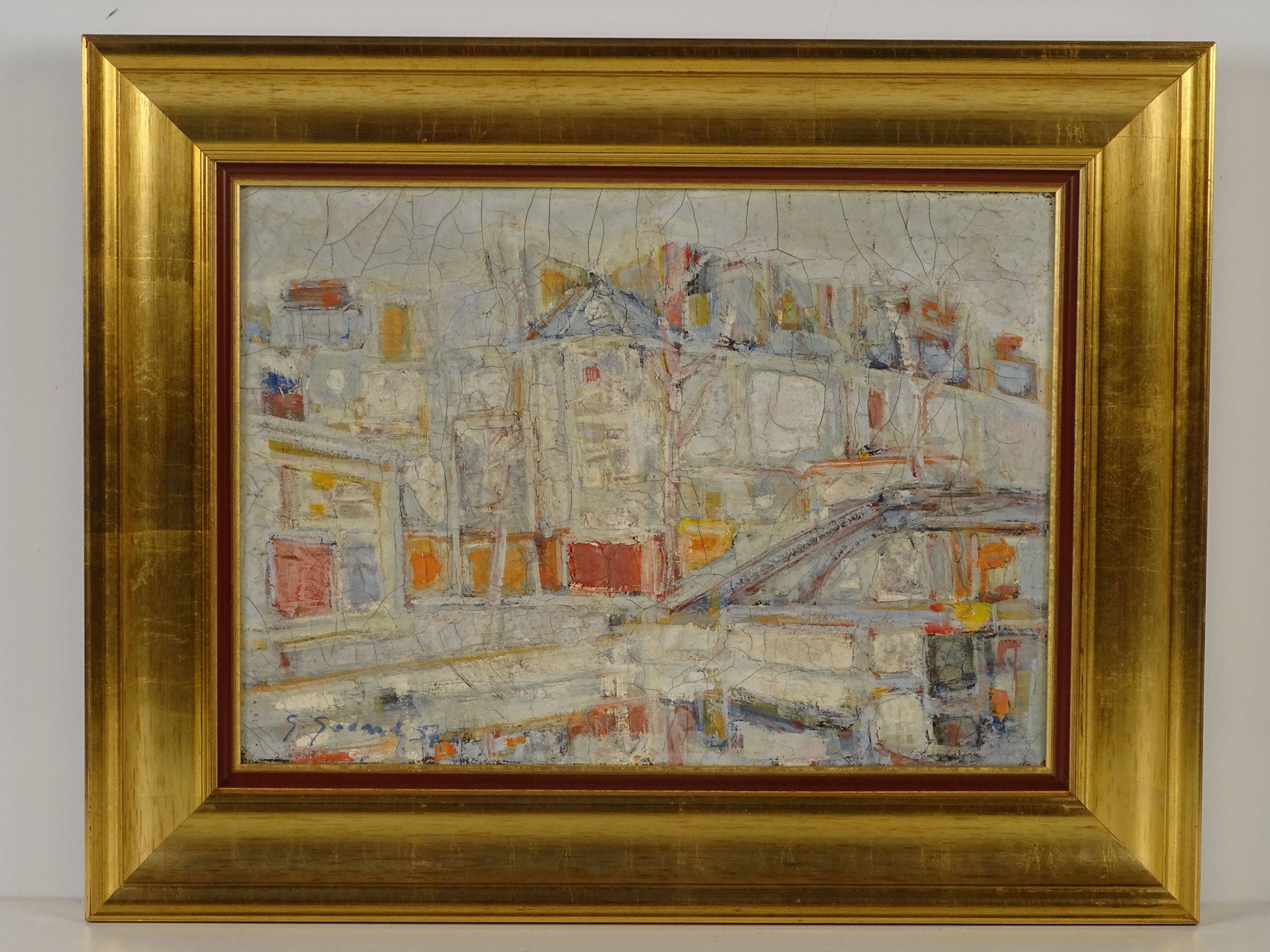 GODARD Gabriel ( 1933 - ), Paris, Canal St Martin, Huile sur toile, signée et datée 57 en bas à gauche, étiquette galerie ROMANET au dos, 33 x 46 cm, craquelures