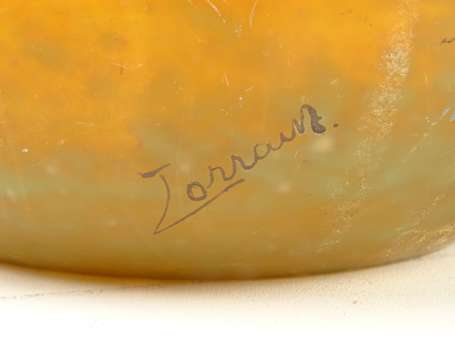 Manufacture BELLE-ETOILE, dirigée par Paul DAUM, vase boule à col annulaire en verre marmoréen orange à vert, signature émaillée Lorrain. H. : 22 cm. Diam. : 22 cm. Griffures et infimes éclats.