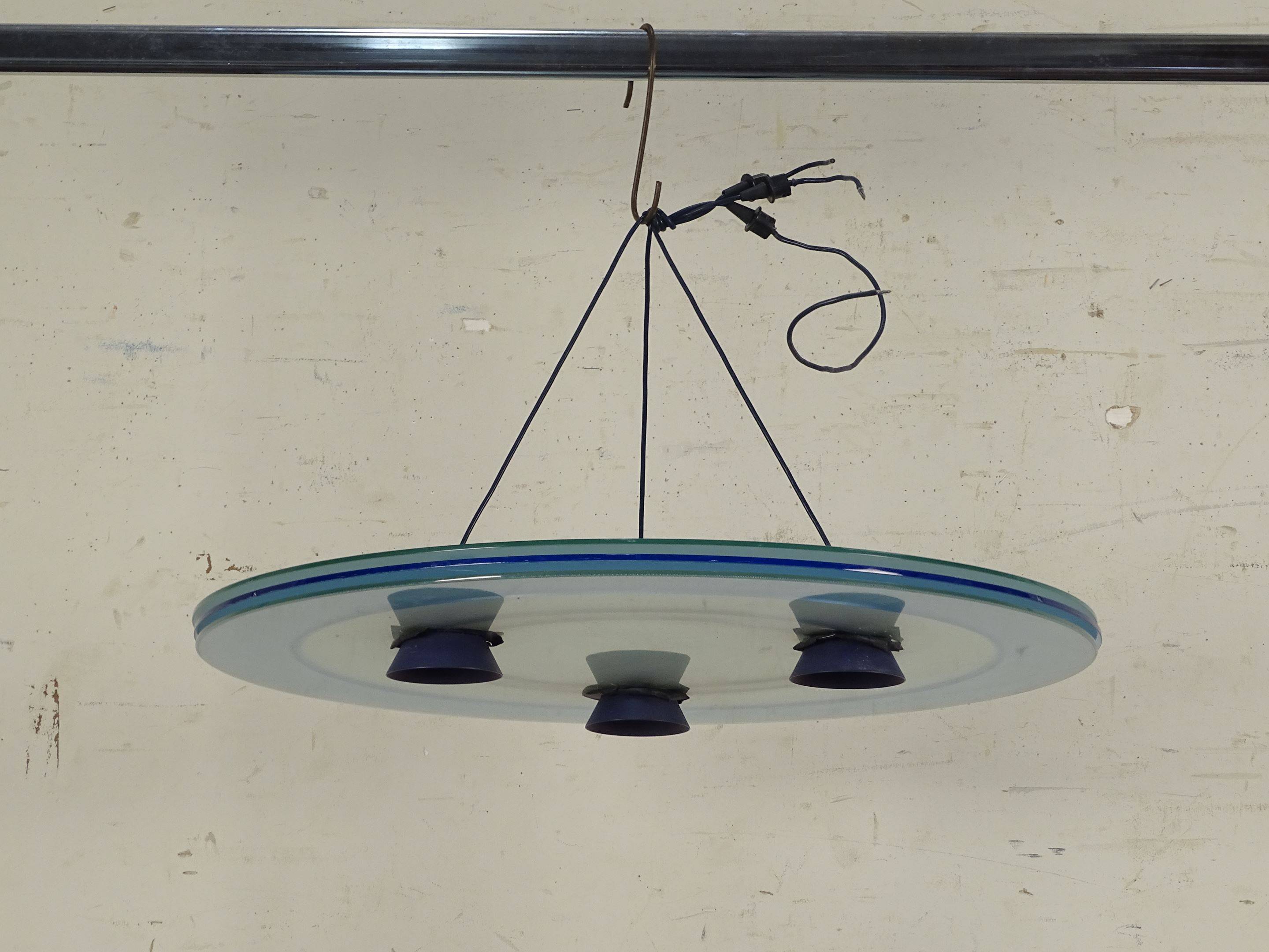 Perry KING et Santiago MIRANDA 1982-89 pour ARTELUCE Suspension Aurora 1040 elle présente une couronne de trois halogènes entre deux cercles de plexiglas et une couronne de plexiglass bleu, le plafonnier de métal laqué bleu. D. 60 cm