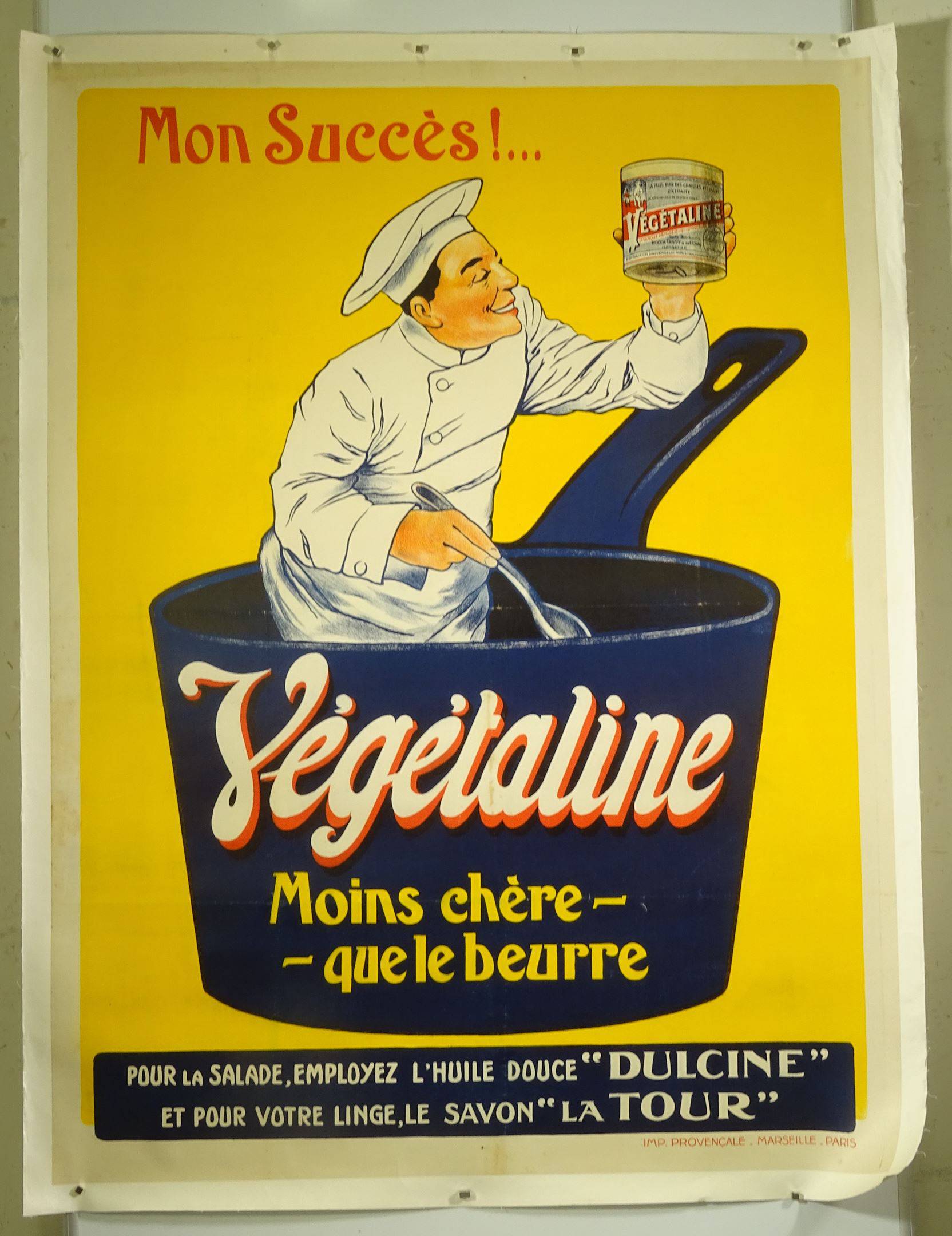 VÉGÉTALINE « Moins chère que le Beurre » : Affiche lithographiée illustrée du Cuisinier passant à la Casserole…Imp Provençale. Quelques petites traces. 120 x 160cm hors entoilage.