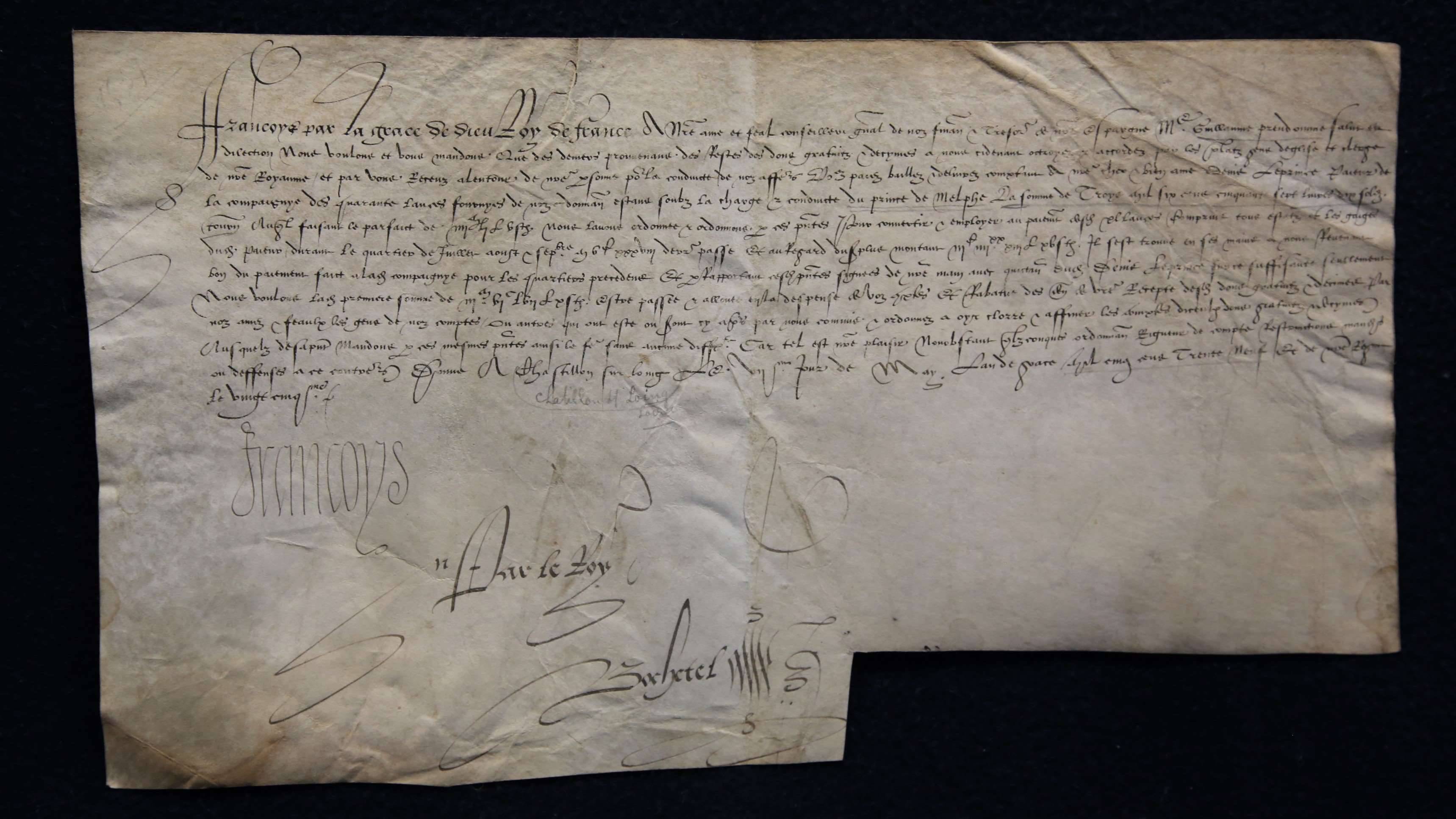 FRANÇOIS 1er - 1539 Ordonnance financière de François 1er 'par la grâce de Dieu Roy de France' adressée à Guillaume PREUDOMME, trésorier des finances royales, de payer à Denis Leprince, payeur de la Compagnie des quarante lances, conduite par le prince de MELPHE, la somme de 3657 livres et dix sous tournois, pour compléter la somme de 46 livres et 5 sols, à affecter au paiement de compagnie pour les mois de juillet, août et septembre 1538. Donné à Chatillon sur Loing, le 7 mai 1539. Signé : 'Francoys' et 'Par le Roy, Bochetel'. Parchemin de 40 x 22,5 cm., 12 lignes. Le prince de Melphe est Jean CARACCIOLI ou Caracciolo (1480 1550), prince de Melfi, duc de Venosa, d'Alcoli et de Soria, fait Maréchal de France par François 1er. Un ordre de paiement similaire est décrit dans le 'Catalogue des Actes de François 1er (1905) Tome VIII, p. 234, n° 31436. Guillaume BOCHETEL, grand diplomate d'origine champenoise, tint la charge de Secrétaire des Finances Royales de 1530 à sa mort (1558). Outre ses occupations financières et diplomatiques, on lui doit « Le Blason du Con » dans 'Les Blasons anatomiques du corps féminin' (1554) : O con gentil, con mignon, con joly, Con rondelet, con net, con bien poly, Con ombragé d'ung petit poil follet, Con, petit con, dont la bouche vermeille, A faict dresser à maint grand vit l'oreille …