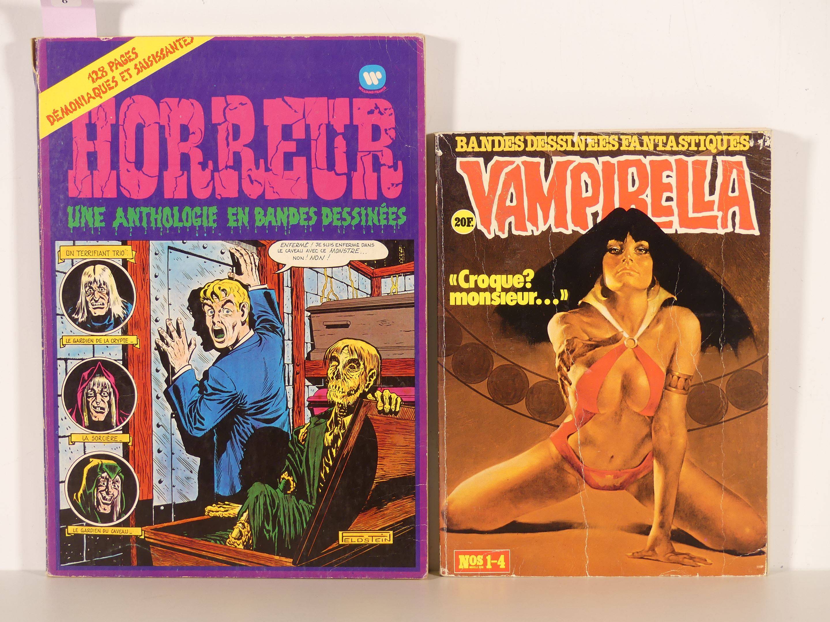 Collectif : Horreur, une anthologie en bandes dessinées en édition originale de 1974 en bel état. On joint la reliure 1 de Vampirella 2e série (n°1 à 4).