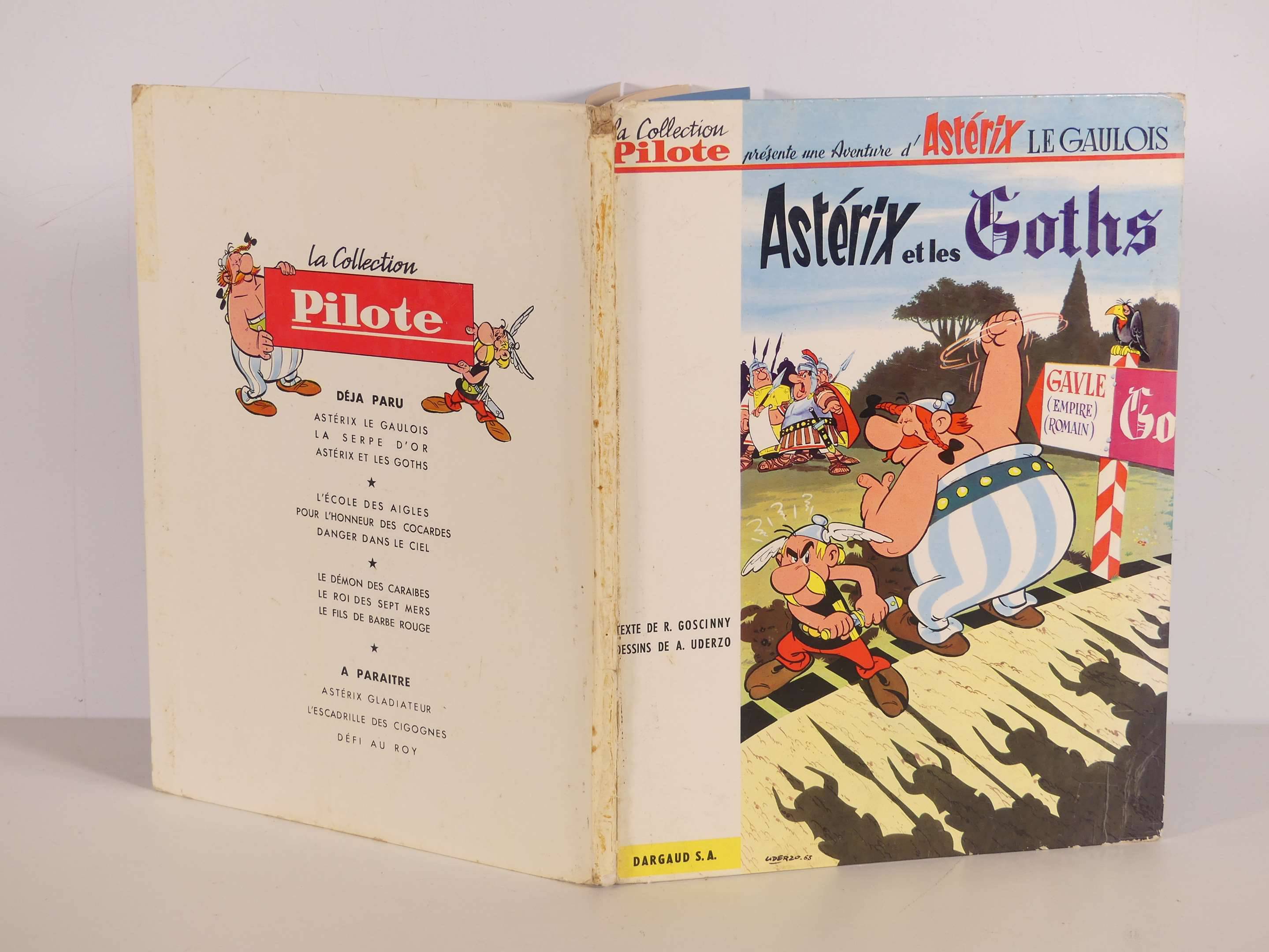 Uderzo : Astérix 3 ; Astérix et les Goths en édition originale de 1963 en assez bel état. Le dos est recollé sur 8 cm en bas sur le mors du 1er plat. Un manque à la coiffe du haut. Intérieur très beau. Un nom d'ancien propriétaire discret en haut de la 1ere garde. Cote BDM 5000 euros.