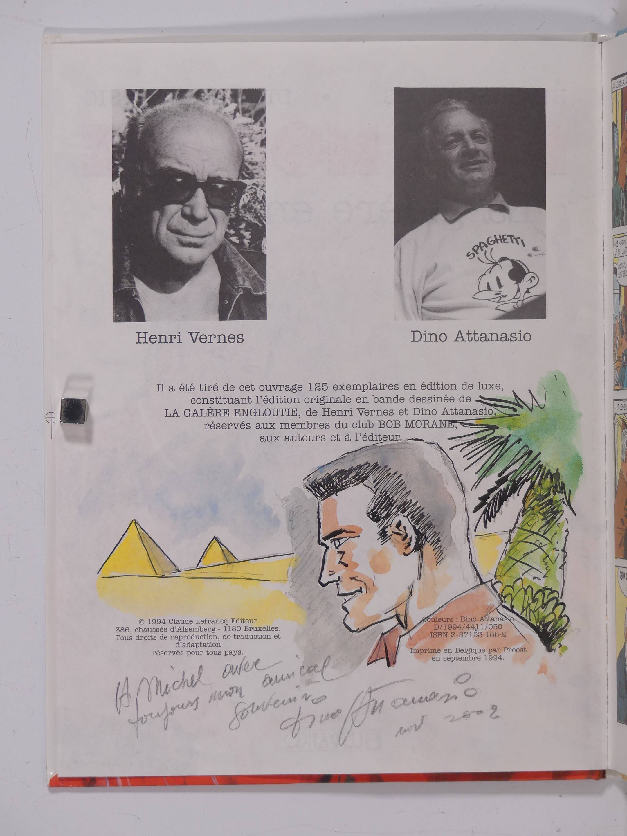 Attanasio : Bob Morane ; La Galère engloutie en édition originale de 1994 en très très bel état, avec une dédicace représentant Bob Morane et une carte postale collée au début de l'album.