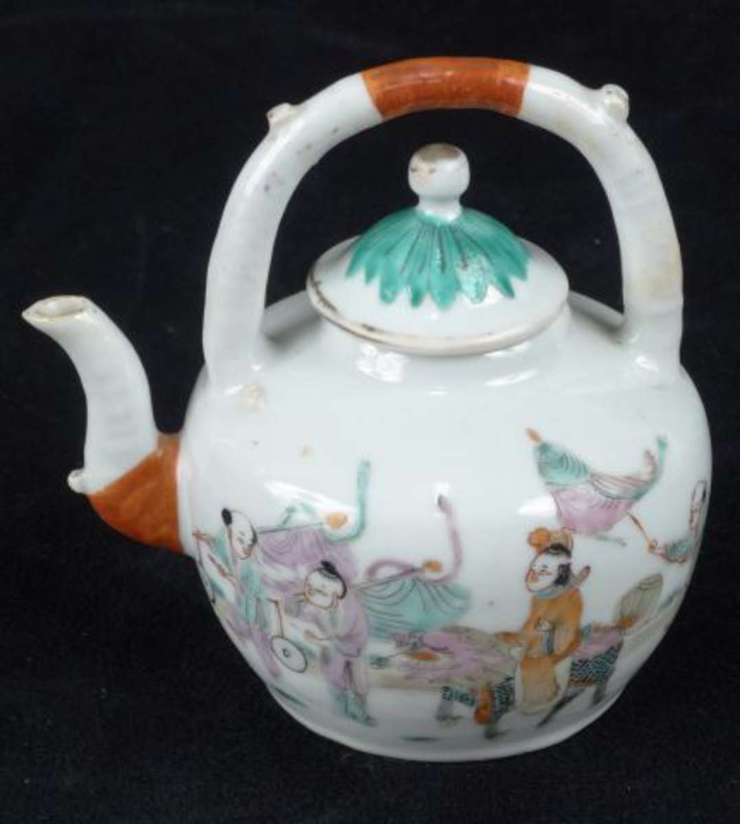 Petite verseuse en porcelaine polychrome, décor de scènes, l'anse cintrée. Chine