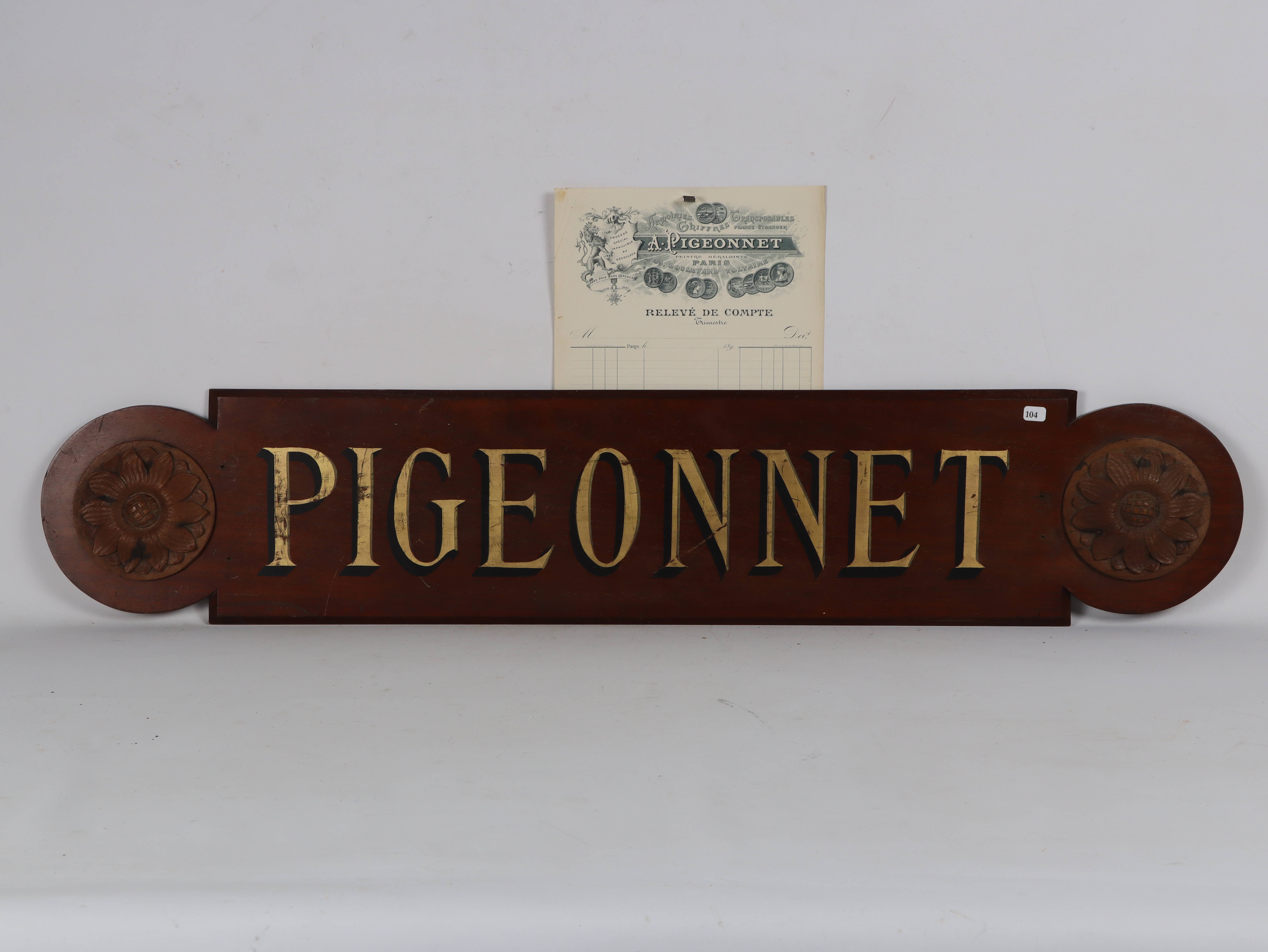 PIGEONNET Peintre Héraldiste / 85 Bd Voltaire à Paris : Bandeau en acajou, Ca 1900. Dimensions 100 x 19.9cm.