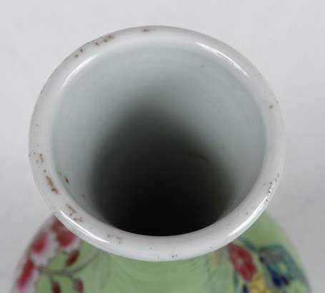 Vase bouteille en porcelaine émaillée vert, décor floral en émaux de famille rose. Chine H. 25 cm