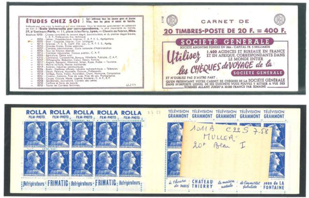 Carnet ancien N°1011B_C22. TYPE MULLER - 20fr.BLEU. Type I. Carnet ROLLA-GRAMMONT-FRIMATIC-CHATEAU THIERRY. Série 7-58. Très bon état.--Cote 100 Euros.