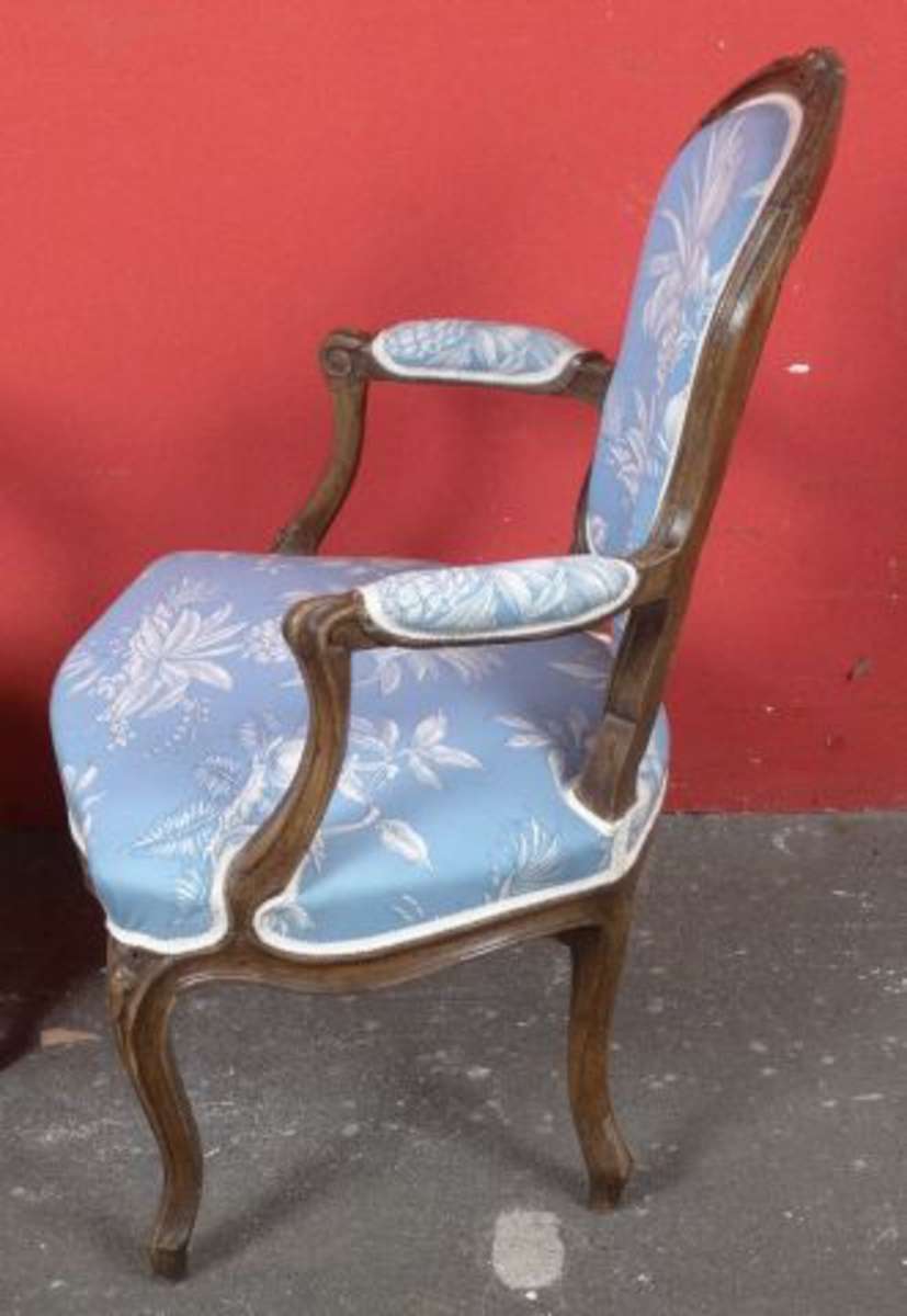 Paire de fauteuils cabriolet en bois naturel mouluré, le dossier sculpté de fleurs est épaulé de feuilles, les accotoirs à manchette reposent par les supports en coup de fouet, la ceinture sinueuse sculptée de fleurs, les pieds galbés agrafés d'une fleur. Louis XV (restauration d'usage)