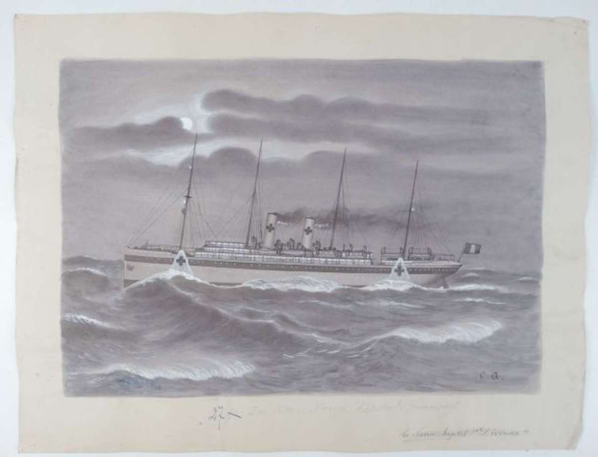 FR 14-18 / EN MER - Le Navire Hôpital "Divonna" - : Aquarelle, Ca 1916, monogramme "C.G". micro-perforations