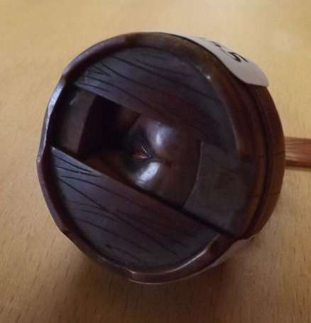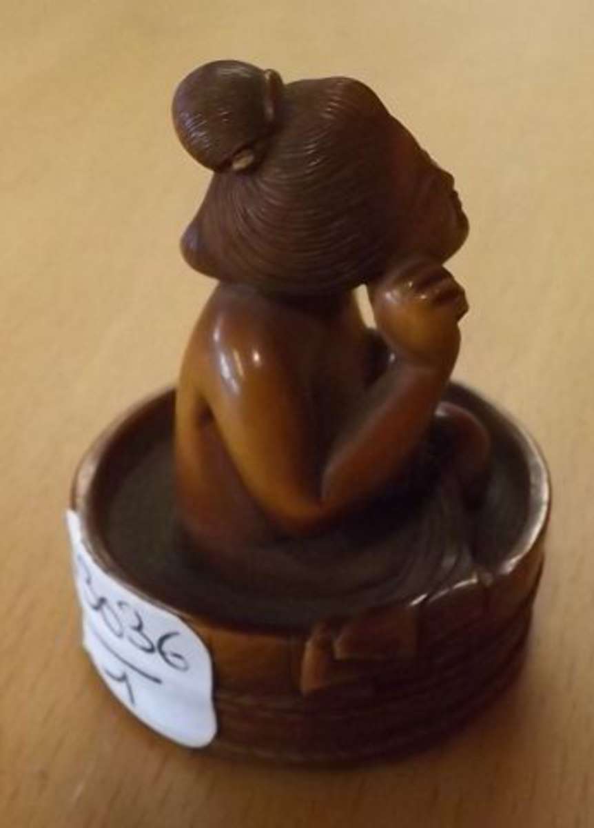 Netsuke érotique en bois représentant une femme prenant son bain