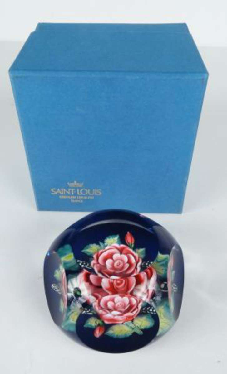Saint-Louis. Presse-papier facetté à motif de rose et boutons de roses sur fond bleu nuit. Edition